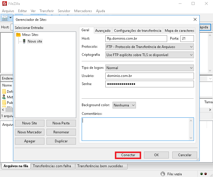 Baixe o FileZilla Client, programa de uso gratuito, pelo site do projeto, execute o arquivo de instalação
