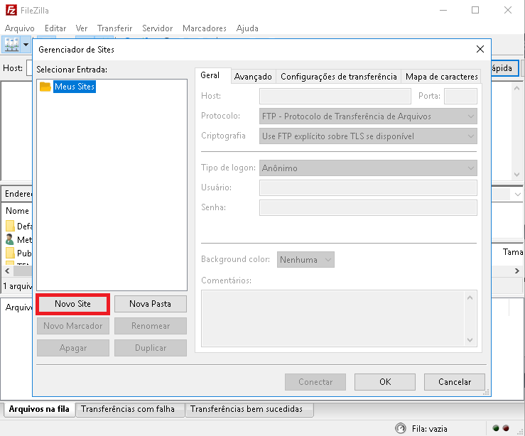 Baixe o FileZilla Client, programa de uso gratuito, pelo site do projeto, execute o arquivo de instalação