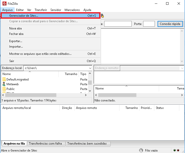 Passo 1: Após o programa abrir, siga para o menu Arquivo e escolha Gerenciador de Sites
