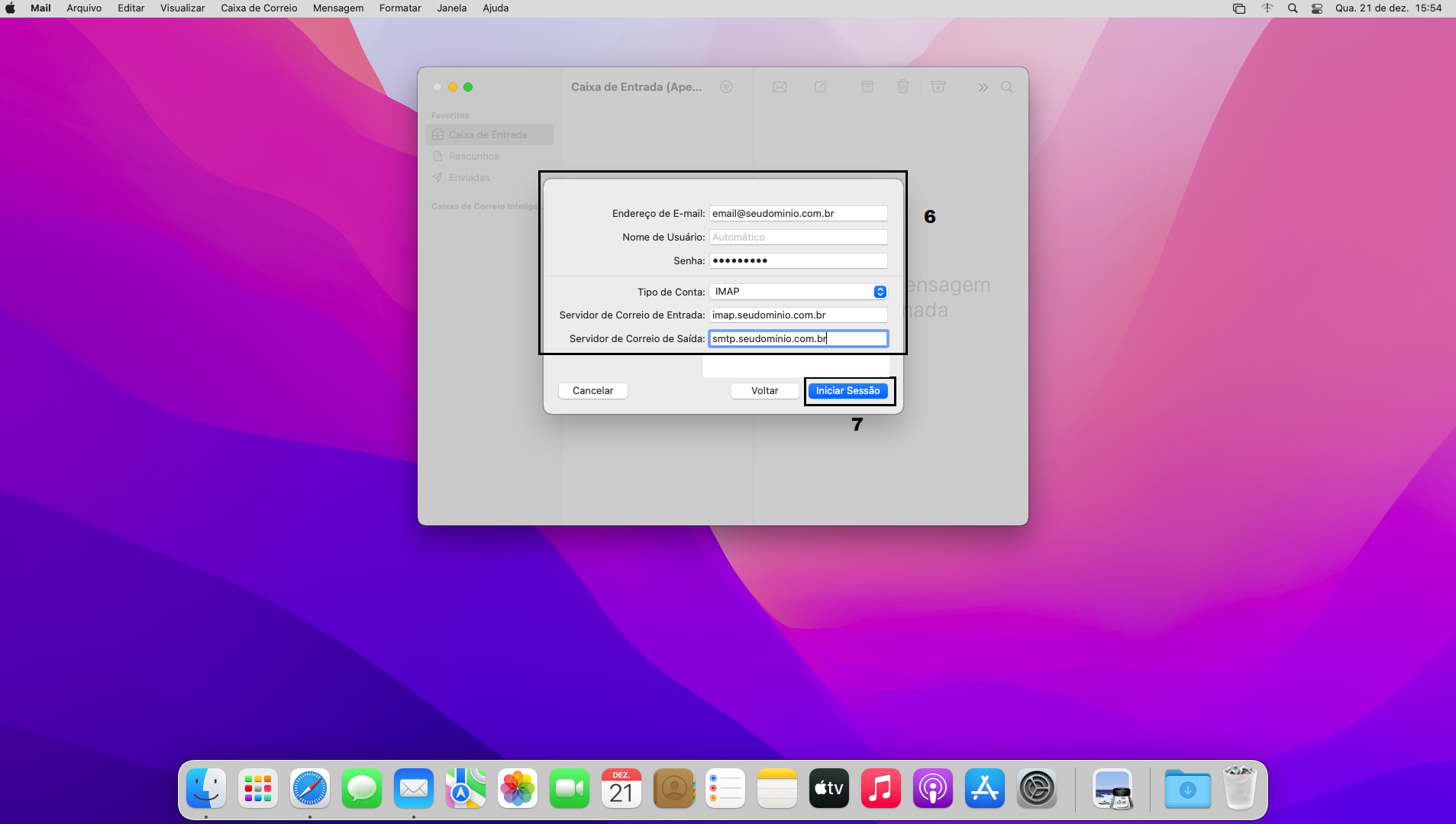 Servidor de Correio de Entrada: imap.seudominio.com.br