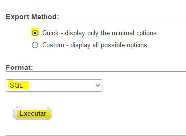 6 – Selecione o arquivo no formato .sql em seu computador, clicando na opção Escolher Arquivo. Deixe marcado o formato SQL e clique em Executar.