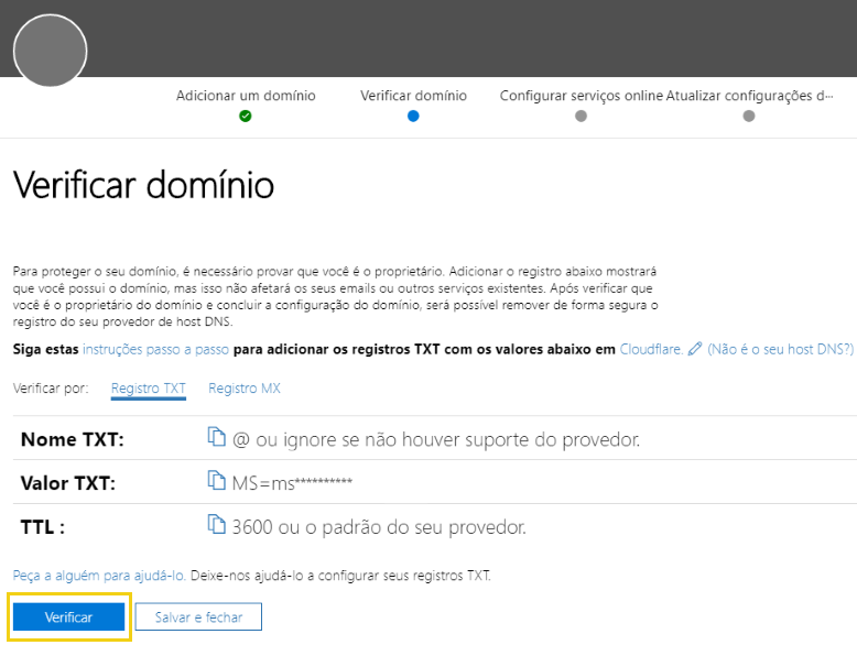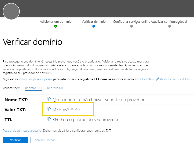 Um código TXT será gerado, copie a informação do campo Valor TXT, e guarde para introduzi-la posteriormente na zona DNS da hospedagem da Metaweb.