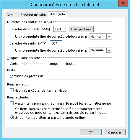 Em Usar o seguinte tipo de conexão criptografada, escolha Nenhum para entrada (IMAP ou POP), Nenhum para saída (SMTP) e clique em Ok.