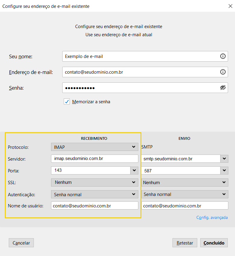 Se escolheu IMAP: insira imap.seudominio.com.br