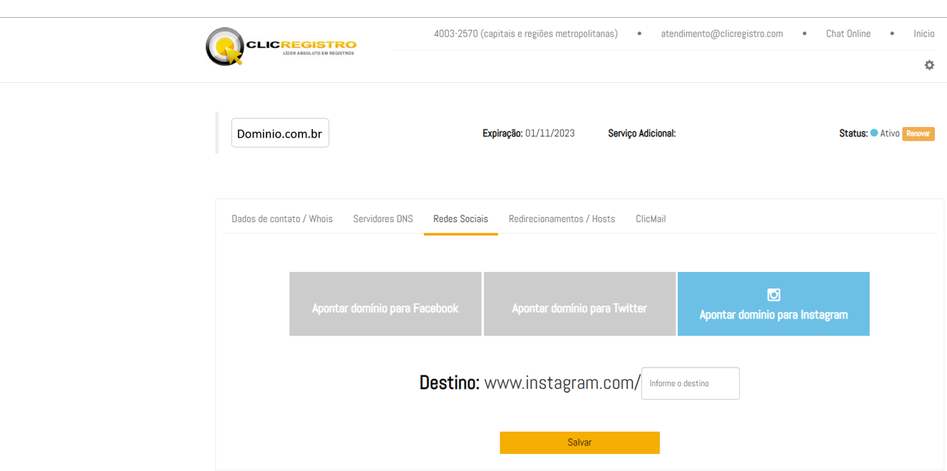 Na tela de configuração do redirecionamento, copie o link do seu Instagram e adicione na opção Destino