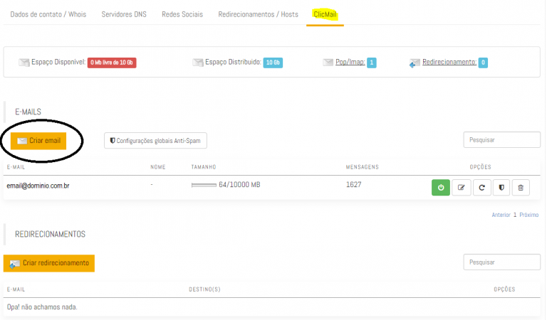 Com o registro do domínio você tem direito a criar 1 e-mail que terá a capacidade de 10 Gb de armazenamento. Se precisar criar mais contas de e-mail @seudominio.com.br será necessário que contrate o pacote adicional de e-mail (ClicMail) com capacidade total de 100 Gb para criar e-mails.