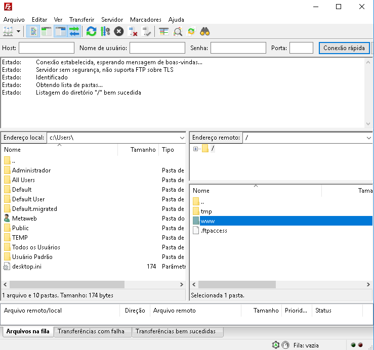 Na coluna da direita (servidor) clique duas vezes em www ou htdocs para entrar na pasta. É nela que você deve colocar os arquivos (páginas, figuras, vídeos etc.) referentes ao seu site.