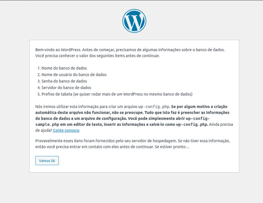 5 – Após enviar, acesse seu site no navegador e já aparecerá a tela de instalação do wordpress como na tela abaixo. Clique em "Vamos lá!" para começar a instalação