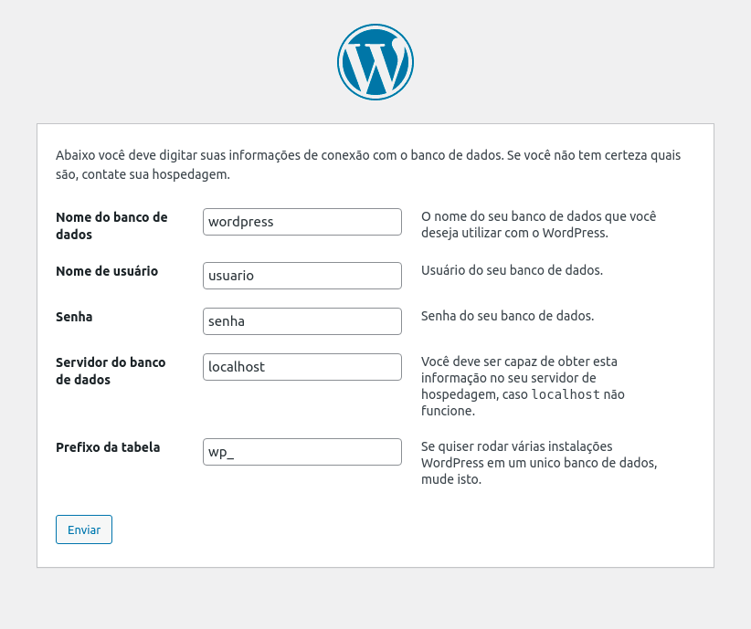 6 – Preencha os dados de conexão do banco de acordo com o informado ao lado. Quando terminar, clique em "Enviar" e depois em "Instalar".