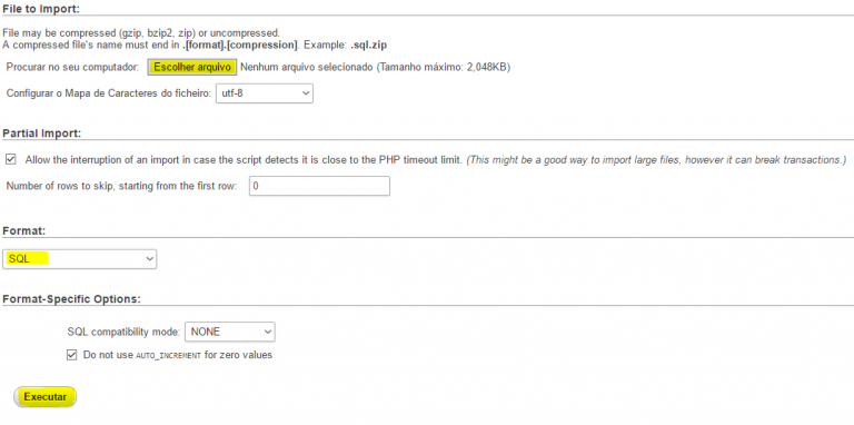 6 – Selecione o arquivo no formato .sql em seu computador, clicando na opção Escolher Arquivo. Deixe marcado o formato SQL e clique em Executar.