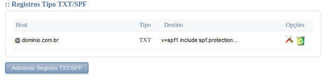 Recomendamos editar a linha existe, substituindo a configuração padrão do serviço Metaweb pelo do Office 365. Para isso clique no ícone Editar (ícone de ferramentas), apague o conteúdo do campo destino e coloque no lugar: v=spf1 include:spf.protection.outlook.com -all e salve.