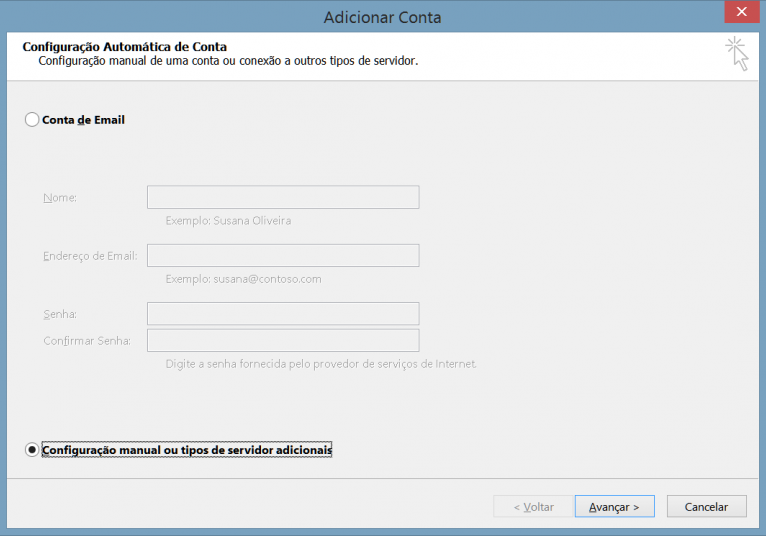 4- Em Adicionar Conta, selecione a opção Configuração Manual ou tipos de servidor adicionais e clique em Avançar.