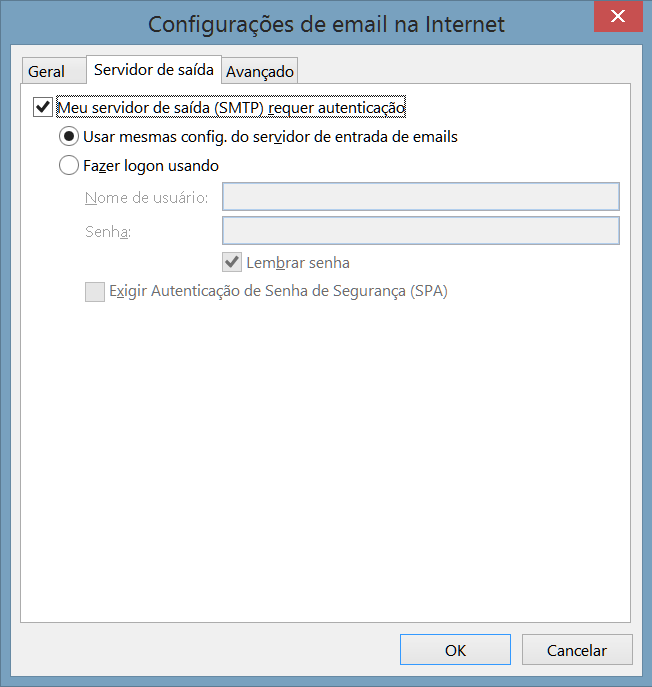 Na aba Servidor de Saída, marque as opções Meu servidor de saída (SMTP) requer Autenticação e Usar as mesmas config. do servidor de entrada de emails. Clique em Ok.
