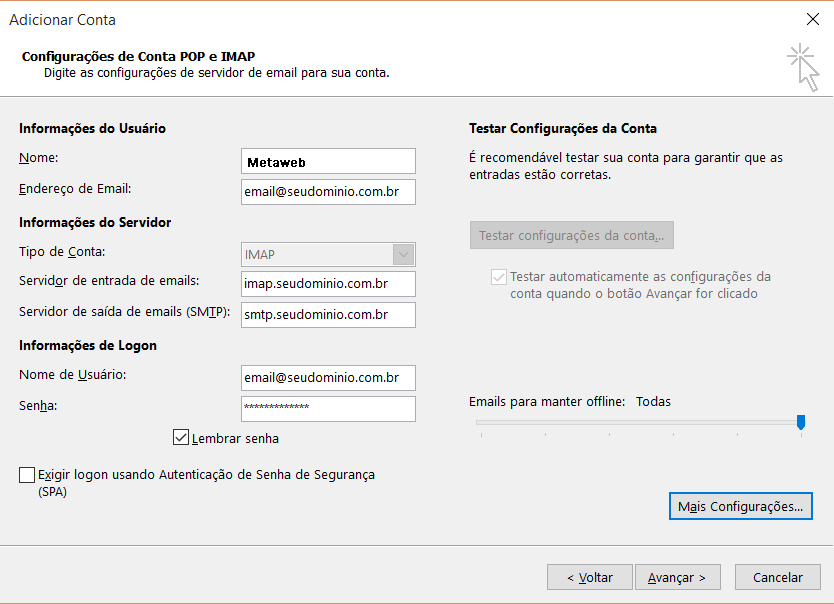 * Recomendamos que deixe a opção de salvar senha marcada. Assim o Outlook não ficará solicitando senha sempre que abrir.