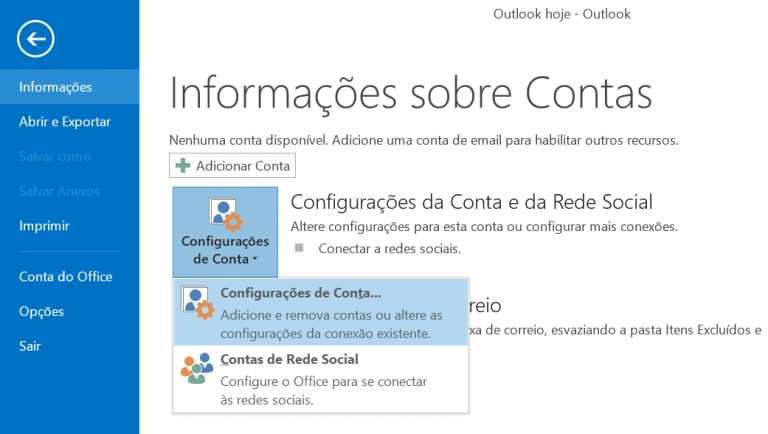 2- Clique em Arquivo na tela inicial. Depois, em Informações, acesse e clique em Configurações de Conta