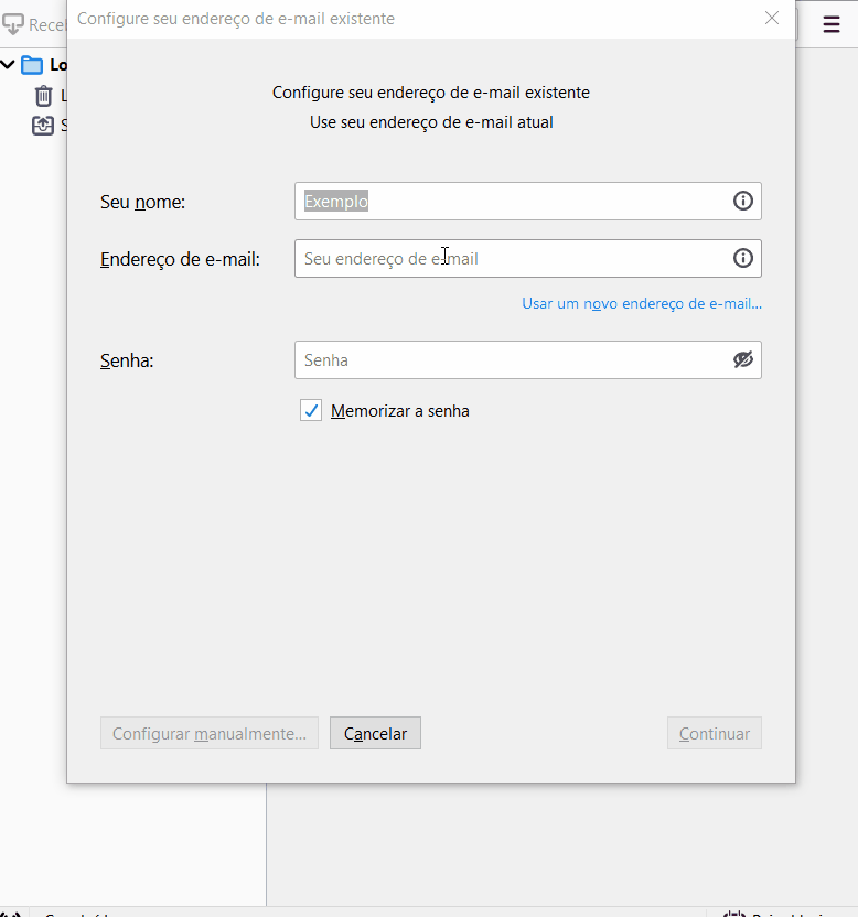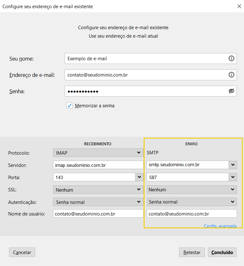 Em Configure seu endereço de e-mail existente, preencha os dados conforme indicado: